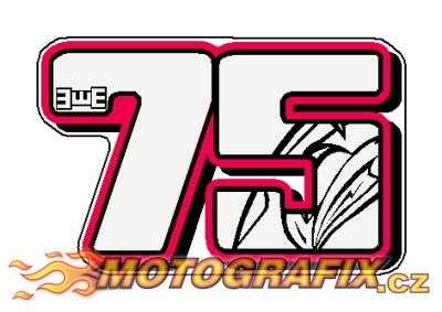 Logotyp Mattia Pasiniho jeho startovní číslo 75. Tisk na průhledné folii. Rozměry: výška 65mm ; šířka 100mm.