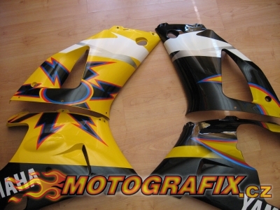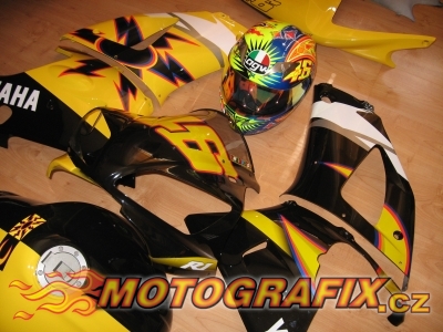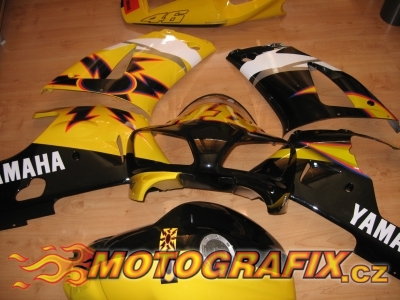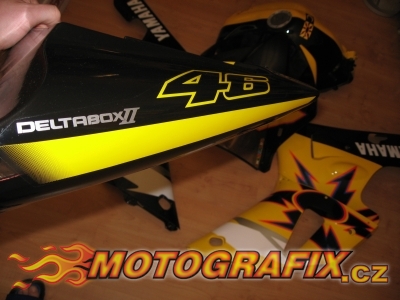 Kompletní sada polepů na motocykl Yamaha R1 model 1998-2001. Univerzální sada polepů shodná shodná s polepy R6 Rossi replika, rozměrově a tvarově uzpůsobená na kapoty R1 model 1998-2001,včetně proužků na kola.