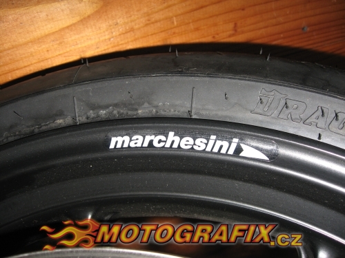 Sada 4 tištěných proužků na transparentní folii k nalepení na dvě kola motocyklu z obou stran. Můžete si zvolit barvu potisku.